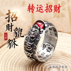 S999纯银转运招财貔貅戒指男女士石榴石个性霸气六字真言心经戒指